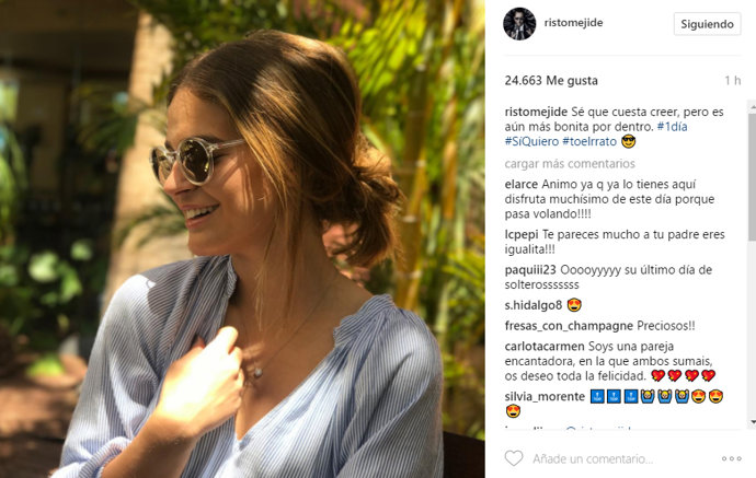 "Sé que cuesta creer, pero es aún más bonita por dentro. #1día #SíQuiero" y concluye la descripción de la imagen en la que aparece su chica en primer plano, sonriendo y con unas gafas de sol, con el hashtagh que comparte con ella y que añaden a todas sus fotos: #toelrrato.