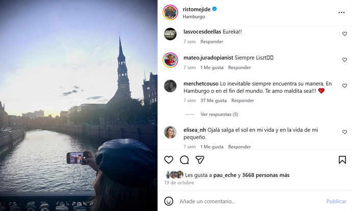 Con una imagen de su nueva novia de espaldas haciendo un selfie desde uno de los 'mil puentes' de la ciudad alemanda, el presentador hacía pública su nueva relación utilizando la palabra 'liebestraum', que en alemán significa 'sueño de amor'. Una publicación que comentaba la propia Merche descubriendo así su identidad: "Lo inevitable siempre encuentra su manera. En Hamburgo o en el fin del mundo. Te amo maldita sea!!!, escribía sin ocultar sus sentimientos.