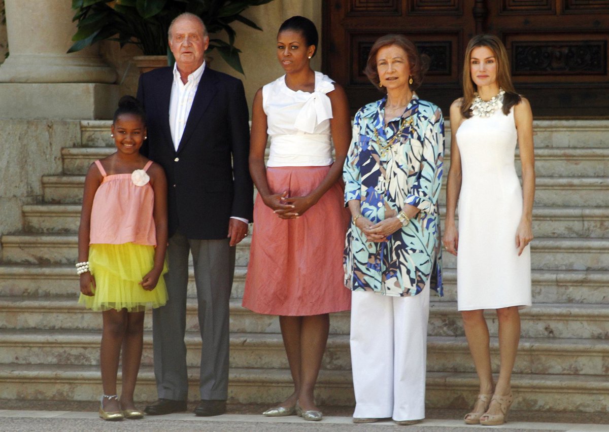 Posteriormente, Don Juan Carlos saludó a Michelle Obama, ataviada con una falda de color salmón, coincidiendo con el de la falda de su hija, y con una blusa blanca sin mangas con dos grandes lazos atados uno en la espalda y otro en el hombro. A continuación, tras saludar al monarca con dos besos, la niña y la madre saludaron a la Reina, enfundada en un pantalón blanco y una blusa de distintas tonalidades azules con manga de tres cuartos y zapatos planos.