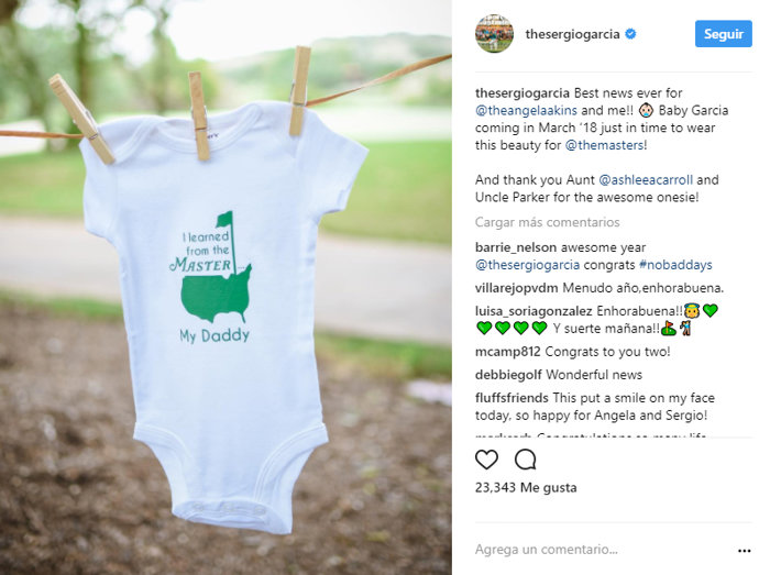 El propio Sergio García ha sido el encargado de dar la noticia, compartiendo una tierna imagen en su cuenta de Instagram acompañada de una emocionante texto, que desvela el entusiasmo de "el niño" por su reto más difícil: "La mejor noticia de mi vida y de la de Angela Akins. Bebé García llegará en marzo de 2018, justo a tiempo para llevar esta belleza al Masters de Augusta", haciendo referencia al body que aparece en la foto, en que puede leerse "Aprendí del maestro, mi papi".
