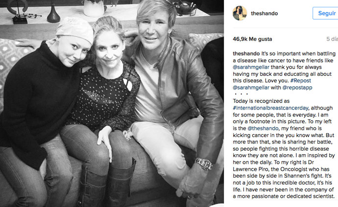 Asimismo, Sarah Michelle Gellar volvía a visitar a la protagonista de Melrose Place. "Es importante cuando batallas contra una enfermedad como el cáncer tener amigos como @sarahmgellar Gracias por estar siempre pendiente y educar a todos sobre esta enfermedad. Te quiero", mensaje que acompañó a la fotografía donde sonreían a la cámara junto a otro amigo de la estrella televisiva.