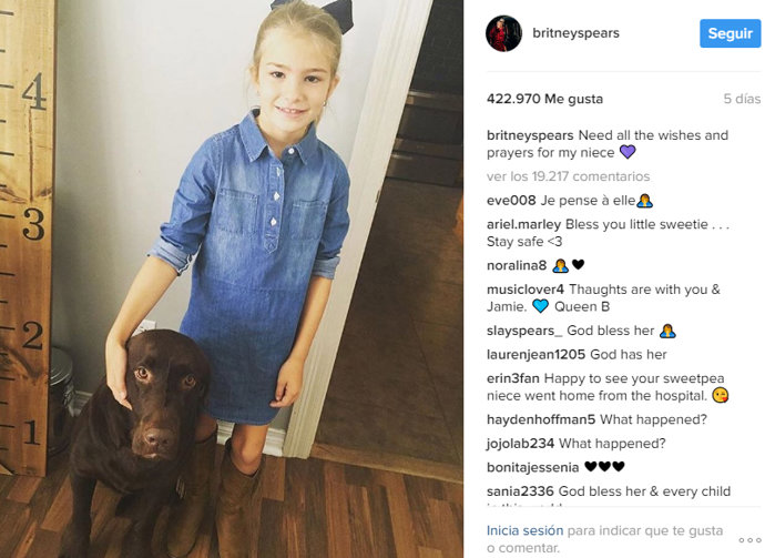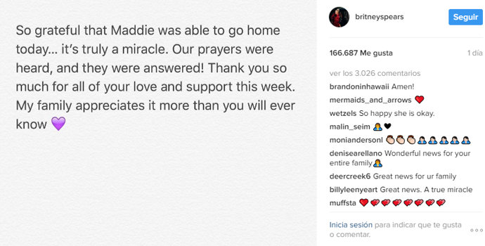 Tampoco la cantante Britney Spears ha dudado en decir por Instagram lo contenta que está por el progreso en la recuperación que la niña ha conseguido durante estos días, logrando ser dada de alta pronto.