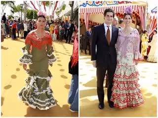 Rivalizando en belleza y elegancia con Sofía, su prima política Cayetana Rivera que, horas después de amadrinar la tradicional exhibición de Enganches en la plaza de toros de La Maestranza, se quitaba la mantilla y el sobrio diseño aguamarina con el que nos dejó sin palabras para ponerse el traje de flamenca y poner rumbo a la Feria. Su elección, un modelo color verde oliva con volantes bordados en blanco, mantón en naranja y como manda la tradición, una enorme flor rosa en la cabeza.
