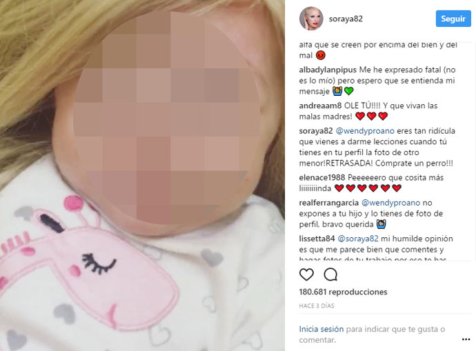 Algunas personas opinaron que Soraya no debía tratar "así" a su hija. Finalmente, la cantante ha explotado y ha decidido responder aquellos que se atreven en poner en tela de juicio su papel como madre: "Algunas de vosotras me habéis escrito por privado diciéndome que pobrecita la niña y que no os hace gracia. Compraos un perro y daos un paseíto, amargadas".