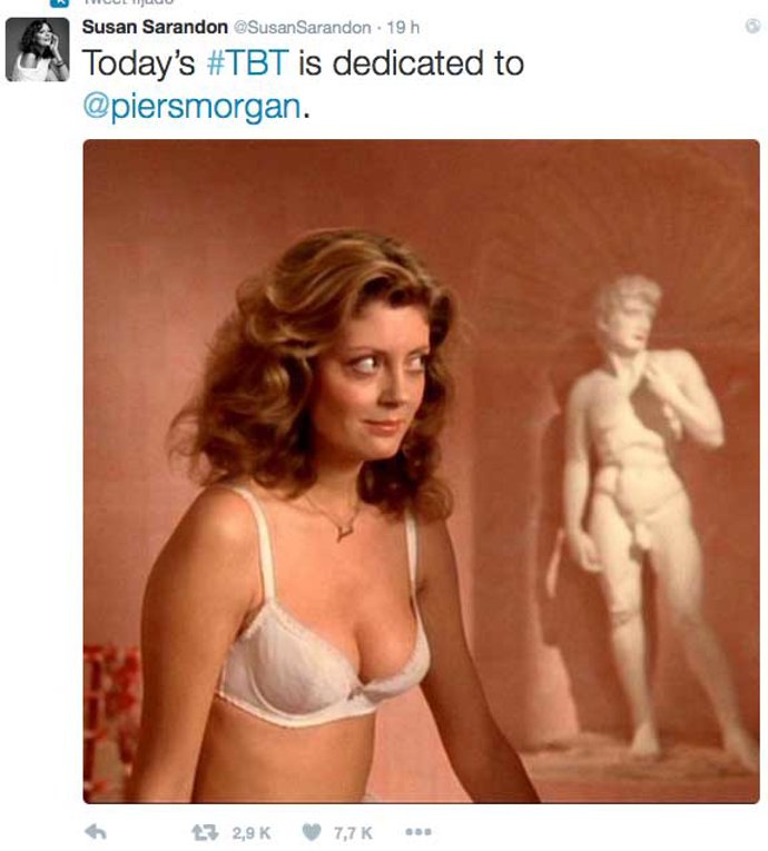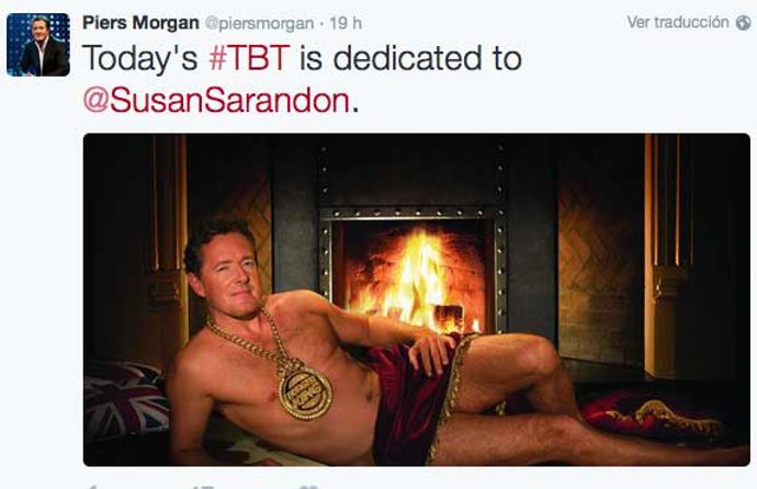 La presión de Morgan ha sido de tal envergadura, que la tarde del jueves se veía obligado a aclarar la situación: “Solo para que conste, Susan Sarandon, creo que tu escote es magnífico. Yo lo habría mantenido oculto en el tributo. Amor Piers”, mensaje con la que pretende sellar la paz entre ambos y procurar que los ánimos se calmen.