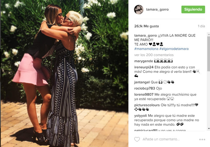 Tamara ha querido celebrar la recuperación de su madre publicando una foto en su Instagram, en la que sale al más puro estilo Victoria Beckham y Harper, dando un beso en la boca a su progenitora. "Viva la madre que me parió" son las palabras de felicidad y emoción que Tamara ha querido compartir con todos sus seguidores. Un mensaje corto y claro pero con mucho significado para madre e hija.