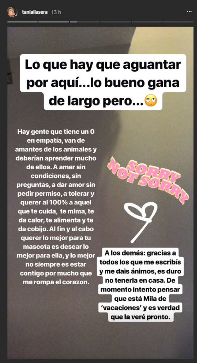La enfermedad de su mascota ha llevado a Tania Llasera ha tomar esta difícil decisión, algo que no ha sido nada sencillo pues ella considera a Mila como su 'primer bebé'. "La primera con el corazón roto soy yo. Siempre he querido que mis hijos crezcan con animales, y mi Mila es mi primer bebé", comenzaba escribiendo en Instagram.