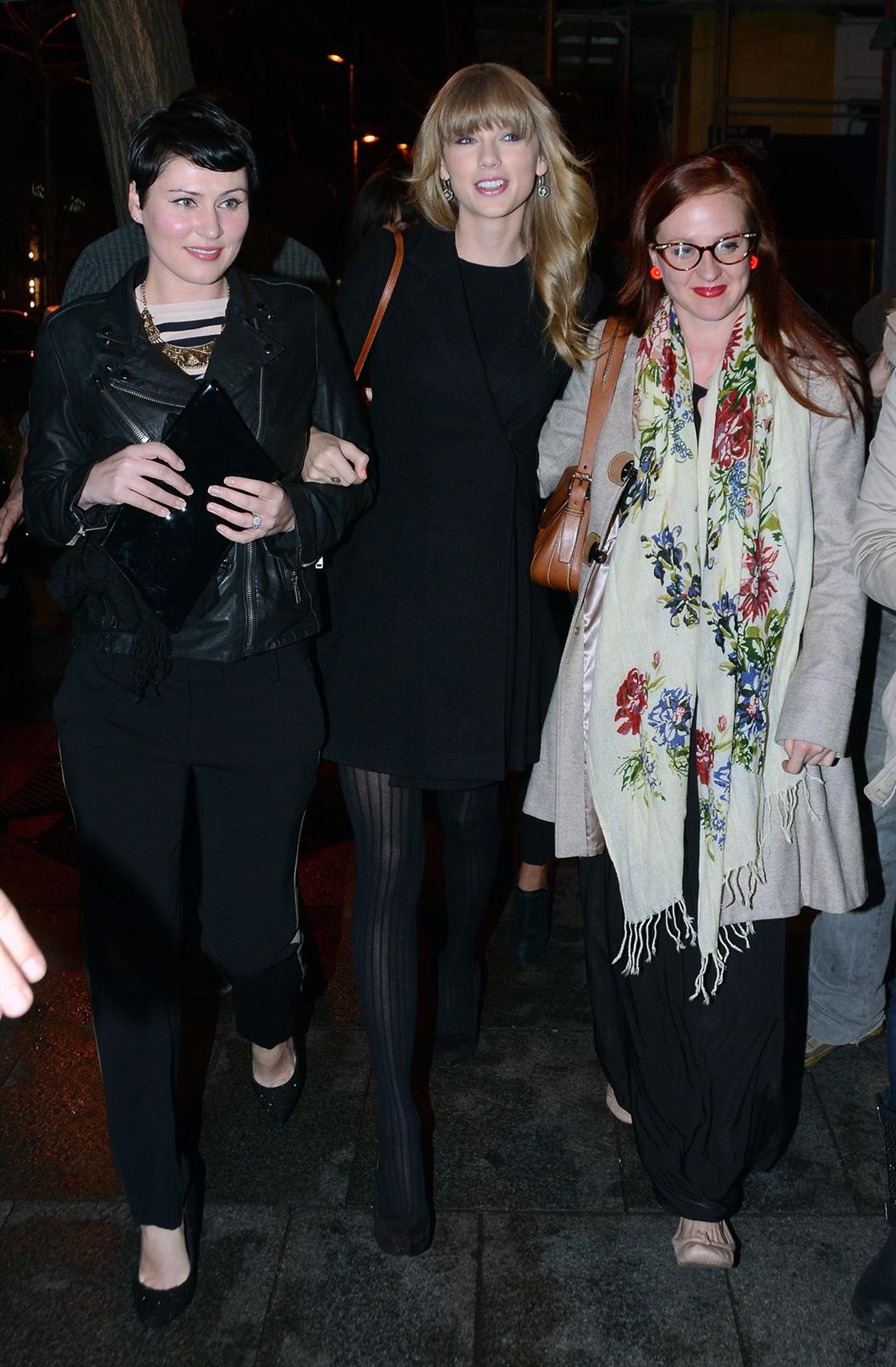 Taylor se ha convertido en un icono de la moda juvenil en los últimos años, y en esta ocasión tampoco defraudó. Eligió un look total black, con abrigo corto de paño y medias caladas estilo años 40, que combinó con zapatos de salón básicos de serraje, con tacón y plataforma.