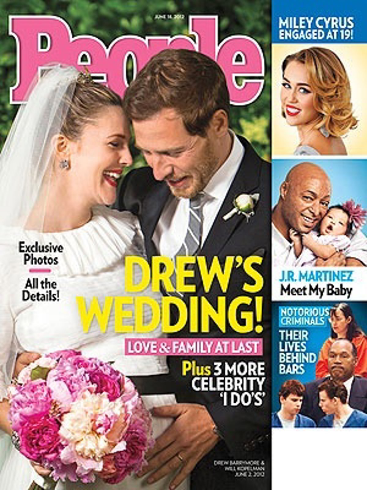 Esta semana, la revista estadounidense 'People' ha querido poner en portada a los protagonistas ya convertidos en marido y mujer. Drew Barrymore aparece feliz y resplandeciente enfudada en un maravilloso y delicado vestido de novia con flores bordadas diseñado y confeccionado, como ya adelantábamos hace un tiempo, en los talleres que la emblemática casa Chanel posee en la capital francesa.