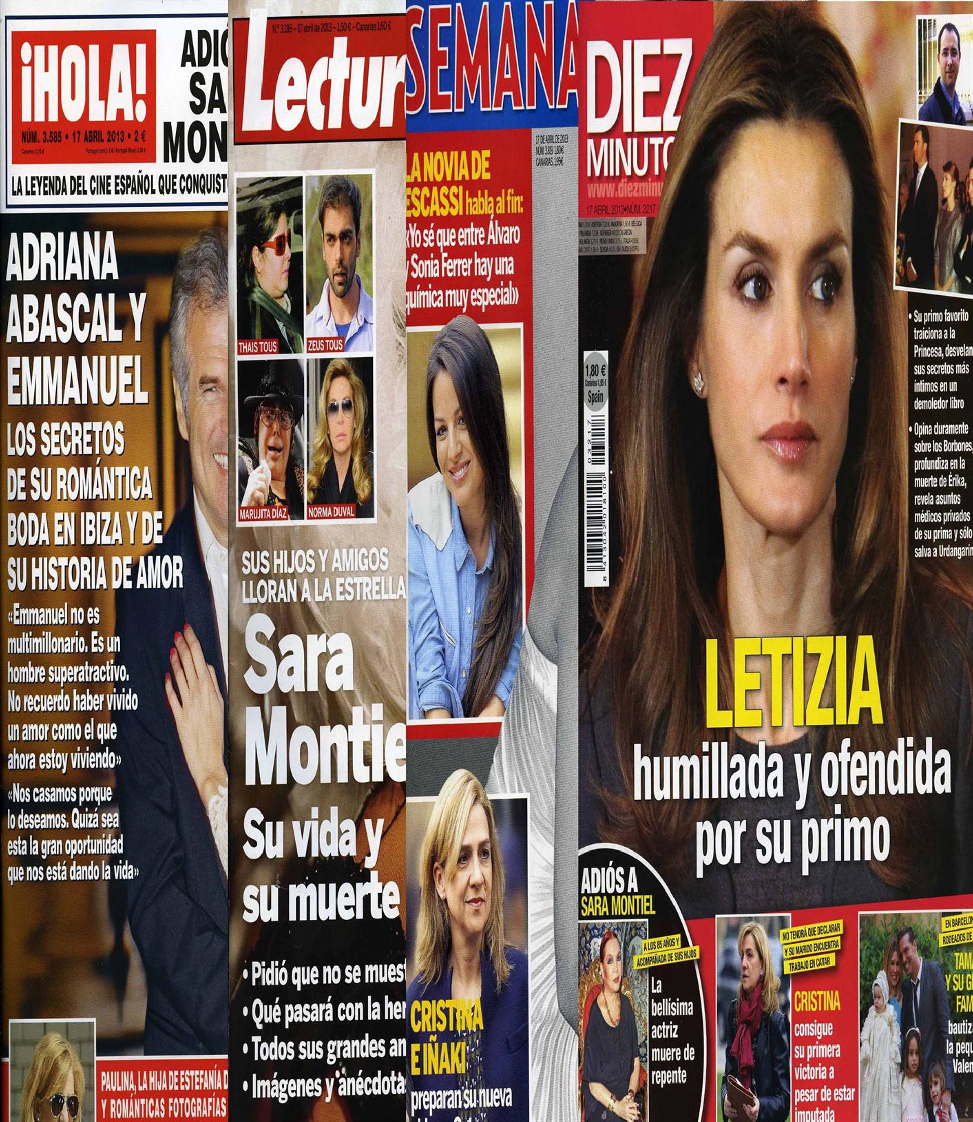 Esta semana las portadas de las revistas nacionales las ha protagonizado el fallecimiento de Sara Montiel. Tanto SEMANA como LECTURAS han optado por abrir con la trágica muerte de la actriz más castiza. DIEZ MINUTOS ha preferido destacar el tema más polémico en la actualidad de la Princesa Letizia y ¡HOLA! se ha querido centrar en los detalles del enlace entre Adriana Abascal y su pareja Emmanuel.