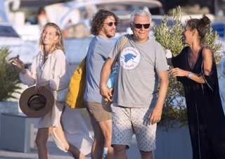 La pareja estuvo acompañada por un grupo de amigos entre los que se encontraba Carles Sans, miembro de la compañía 'Tricicle'. Precisamente a su llegada al puerto vimos a Vanesa muy compenetrada con su amigo Carles. Muy estilosa, Vanesa lucía espléndida con bikini, blusón y sombrero borsalino.