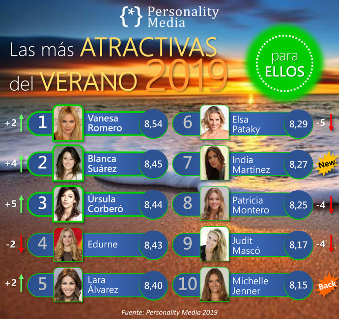 La actriz Elsa Pataky (8,29), un referente en esta clasificación de atractivas desciende desde el top 1 del año pasado a la sexta posición. En cuanto a Judit Mascó también ha descendido 4 puestos respecto al año pasado pero mantiene su presencia dentro del Top 10 en un ranking de mujeres de edad media de 36 años y demuestra, un verano más, que el atractivo y la madurez son más que compatibles. Patricia Montero, la mamá todoterreno, cae hasta la octava posición respecto al verano.
