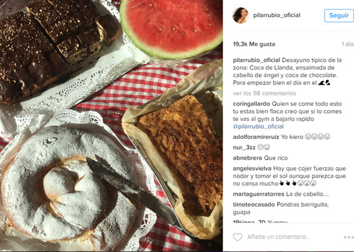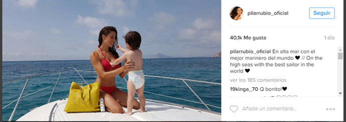 Durante este último día ha compartido con sus seguidores varias instantáneas de sus vacaciones en Mallorca, desde apetitosos desayunos, en el que no podía faltar una ensaimada de cabello de ángel, hasta una instantánea en la proa de un barco junto a su hijo mayor, Sergio, con el comentario "En alta mar con el mejor marinero del mundo".