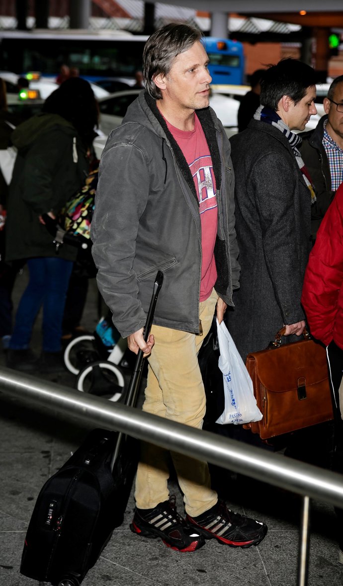 El artista, de ascendencia danesa vestía de manera cómoda e informal con pantalón de pana, deportivas y parka a su regreso a Madrid. Portaba una pequeña trolley donde guardó sus enseres personales tras cumplir con sus proyectos profesionales. Asimismo lucía un rostro barbilampiño sin su característica perilla, quizá por exigencias del guion. El escritor y poeta habla español con fluidez, pues pasó su infancia entre Venezuela y Argentina.