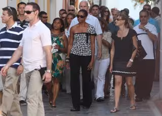 Como en una versión moderna de 'Bienvenido, Míster Marshall', la Costa del Sol esperaba expectante la visita de Michelle Obama y su hija pequeña, Sasha. La familia del presidente de Estados Unidos, acompañada de varios amigos, llegó al aeropuerto de Málaga en un Boeing de las Fuerzas Aéreas del país norteamericano a las 10.30 horas del pasado 4 de agosto, día en que Barack Obama celebraba su 49 cumpleaños. Desde el aeródromo, Michelle y los suyos se trasladaron al Hotel Villa Padierna por carretera, en una comitiva con catorce vehículos. La Primera Dama tiene reservadas 60 habitaciones en el complejo de lujo, situado entre los municipios de Benahavís, Marbella y Estepona. Además, el establecimiento ha cerrado el club de playa para que Michelle, Sasha y sus amigos disfruten de las instalaciones durante sus cuatro días de estancia.