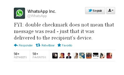 Sin embargo la mayoría de los problemas vendrán a raíz del maldito 'Doble Check'. El Doble Check son los dos tics verdes que se ponen en los mensajes cuando se han leido. Pues no, esto es mentira, el doble check no aparece cuando lo leen, sino cuando se envía. Algo que Whatsapp ha tenido que aclarar por su página web y por twitter seguramente por la cantidad de rupturas que ha provocado.