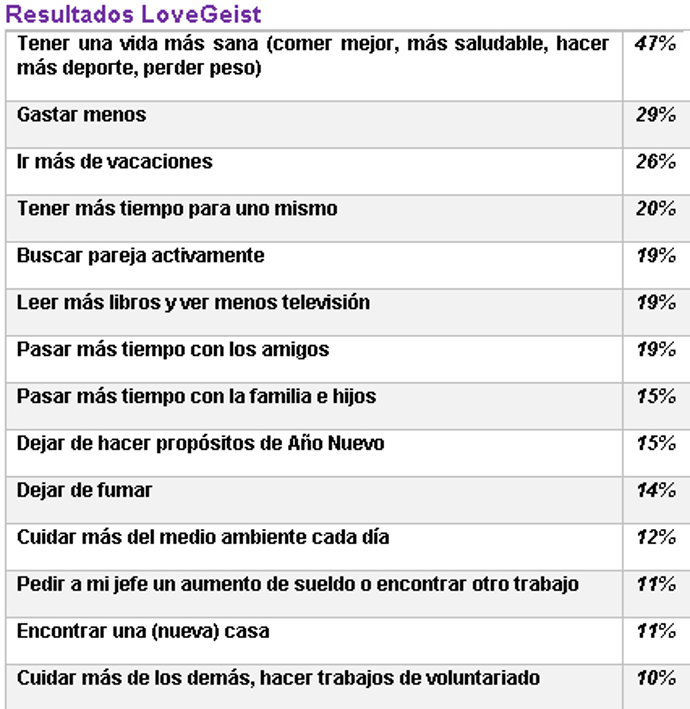 Pero como hemos mencionado anteriormente no todo es el amor, en nuestra lista de propósitos también aparecen temas tan recurrentes como hacer dieta, ahorrar o dedicar más tiempo al ocio. Para el nuevo año, casi la mitad (47%) tiene como prioridad llevar una vida más sana, 29% se plantee llevar una vida más austera, mientras que el 26% se marca como objetivo viajar más.