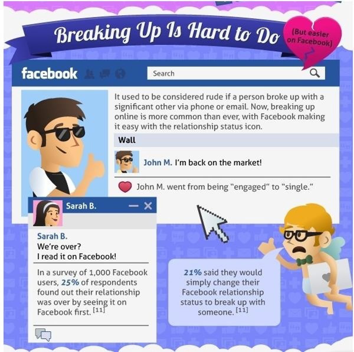 Cada vez son más las parejas que se forman, desarrollan o se destruyen debido a la influencia de redes sociales como Facebook. Según la infografía elaborada por la compañía de lencería Julianna Rae, el 21 por ciento de los usuarios de 'social media' considera la posibilidad de romper con alguien sin dar mayor explicación que cambiando el estado de Facebook. De los millones de usuarios de Facebook el 60 por ciento ya tiene algún tipo de relación, pero aún queda un 37 por ciento de solteros y solteras con ganas de conocer a su media naranja por internet.