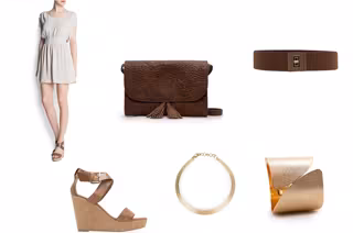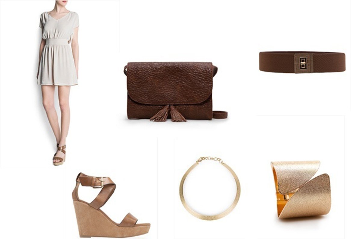 Un vestido cortito, en tono beige y ceñido en la cintura, pero suelto a la vez. En sí el vestido puede tener un uso para ir bastante informal, pero combinado con las cuñas de color madera y el cinturón de cintura marrón ya te da un toque un poco más arreglado. A esto hay que añadirle los complementos fundamentales para que estés completa. El collar, muy simple y en tono dorado junto con el brazalete, te darán un toque más lujoso y el bolso en tono marrón a juego con el cinturón queda perfecto.