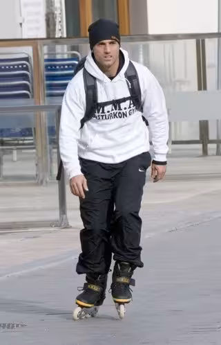 Como si de un verdadero roller se tratase, vemos al cantante ataviado con el equipo completo de ropa deportiva. Con un gorro de lana para cubrirse del frío en tierras asturianas, donde pasaba junto a su mujer e hija las vacaciones de Navidad.