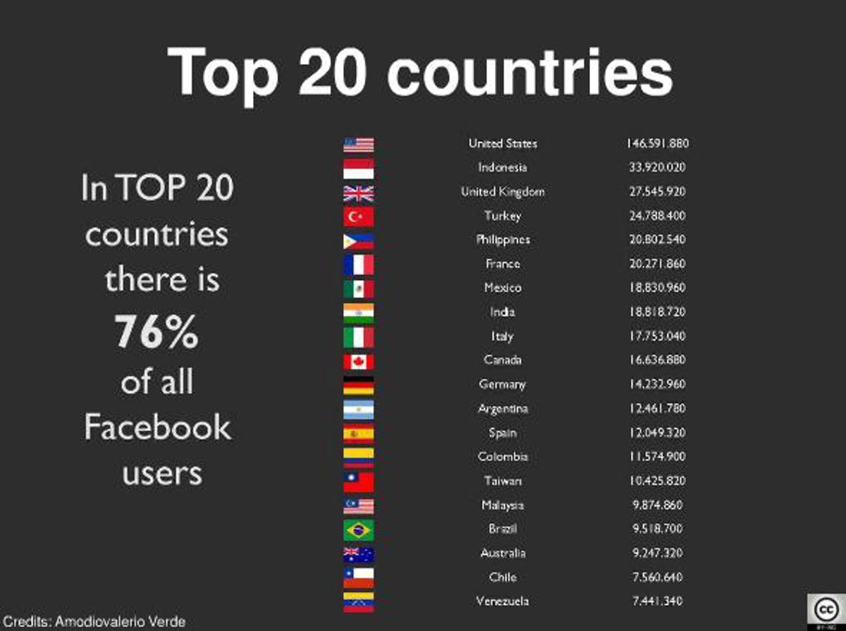 En los datos oficiales de Facebook se puede ver que el crecimiento de la red social no se detiene, pero está muy localizado en determinadas zonas. El 76 por ciento de los usuarios totales de Facebook, 452,9 millones se reparten entre los 20 países que encabezan la lista. En África y Asia los porcentajes de penetración de Facebook todavía son muy bajos, países como la India cuentan con una gran masa de usuarios potenciales.