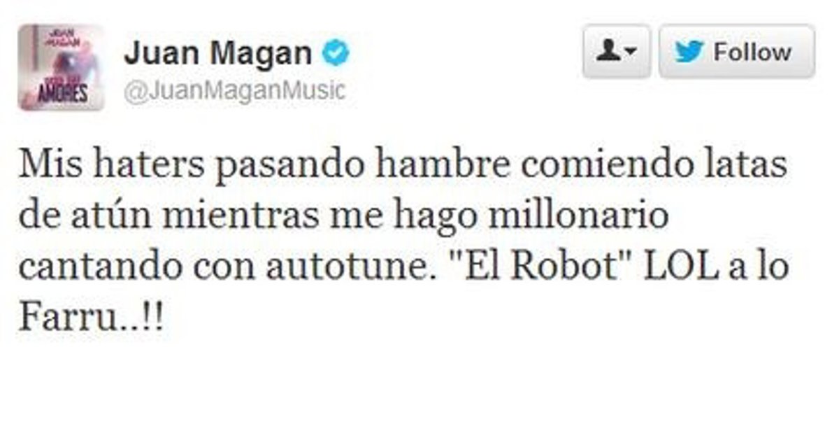 Juan Magán publicaba un tweet desafortunado, en el que ponía: "Mis haters pasando hambre comiendo latas de atún mientras me hago millonario cantando autotune. "El robot" LoL a lo farru". La publicación está causando sensación en Twitter y creando mucha polémica.