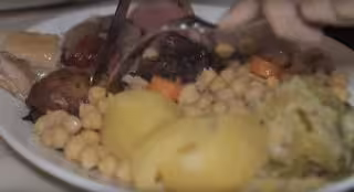 M.B: Los garbanzos se cuecen en la misma, los metemos en una redecilla para que no es despellejen ni estén nadando y todo en la misma hoya. A fuego lento, empezamos los miércoles y los sábados a las nueve de la mañana y a las doce y media, una menos cuarto, lo tenemos casi terminado. y a comer. Para vender 30 ó 40 cocidos que se van horas, hay que dejarlo tiempo. Un buen cocinero con algo normalito hace buena cocina.