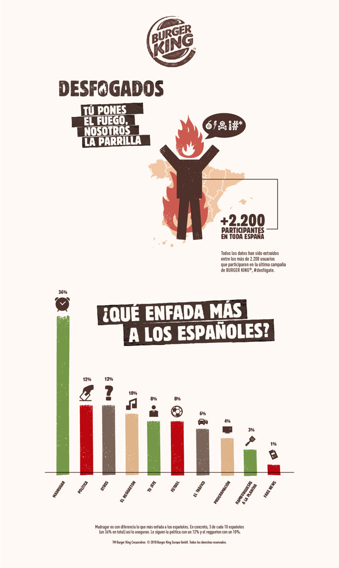 Madrugar es con diferencia lo que más enfada a los españoles. Según una campaña realizada por Burguer King se ha descubierto que 3 de cada 10 españoles aseguran que madrugar es lo que más les enfada.