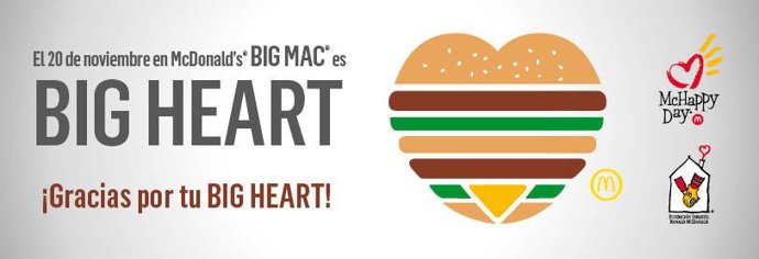 Mañana día 20 de noviembre se celebra el Día Universal del Niño y con este motivo McDonalds España ha querido mostrar su faceta más solidaria con la iniciativa "Big Mac, Big Heart" en la que anima a los consumidores a comprar hamburguesas Big Mac y de esta forma respaldar con su "corazón" esta solidaria causa.