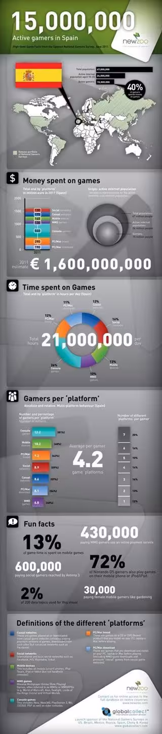 Si el dato del volumen de negocio de los juegos en España muestra el interés de los usuarios, el análisis del tiempo de consumo que efectúa Newzoo confirma las impresiones. Según la compañía, cada día, los 15 millones de jugadores españoles suman un total de 21 millones de horas.