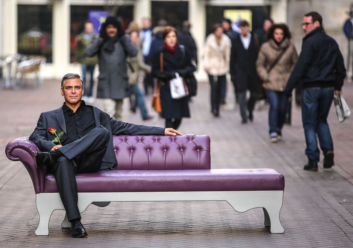 Todo aquel que pasee por las calles de Londres, en concreto por Baker Street, el día de San Valentín tendrá el placer de poder sentarse con George Clooney en un cómodo sofá. Un George Clooney perfectamente trajeado - traje gris marengo, camisa negra y zapatos de vestir del mismo color - espera sentado con una rosa en la mano a todo aquel que quiera retratarse con él.