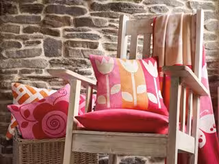 La Home Collection de Giesswein alterna, en sus exclusivas fundas para cojines y mantas, flores y mariposas de diversos tamaños y colores, que transformarán fácilmente cualquier ambiente.