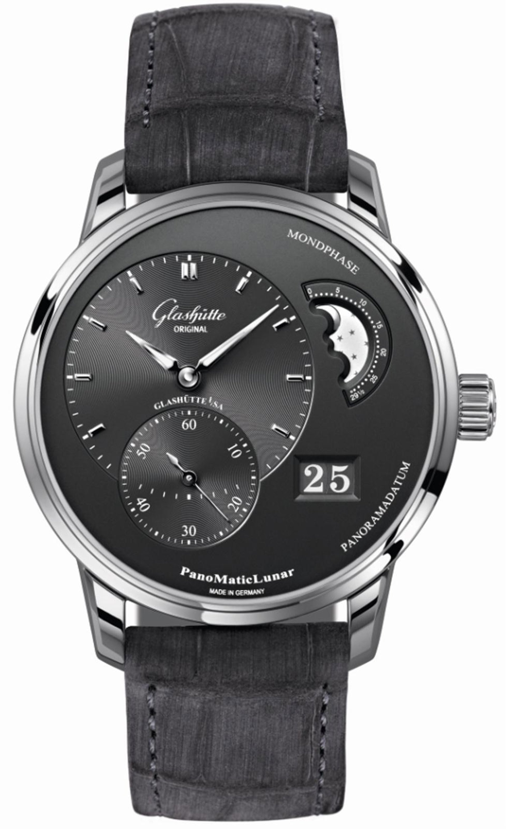 PanoMaticLunar del gran relojero alemán de alta gama, Glashütte Original. Los diseñadores propios de la compañía han creado una caja cilíndrica notablemente mayor para sus relojes mecánicos, todas provenientes de su manufactura de Glashütte.