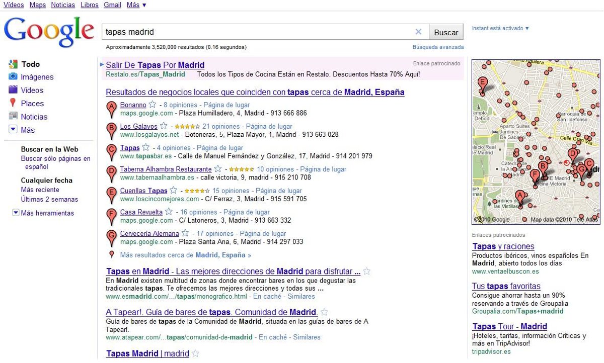 Los resultados de la Búsqueda de lugares aparecen automáticamente en Google cuando se detecta que se está buscando información local pero además, aparece un nuevo enlace, 'Lugares', en la parte izquierda de la página de resultados de búsqueda, para que se pueda acceder a este tipo de resultados en cualquier momento.