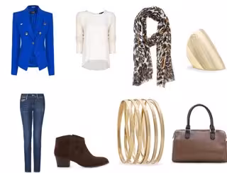 Pero, ¿cómo podemos darle ese toque especial a nuestro outfit? Muy sencillo, la clave está en los accesorios: joyas en tonos dorados, un pañuelo en animal print y la chaqueta; sin duda la pieza estrella de este outfit. Una blazer en tono azul klein cuyos botones son dorados, algo que permitirá crear una perfecta simbiosis con las joyas.