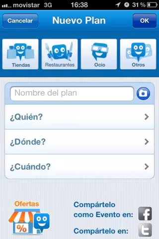 En este caso, el botón central es el eje de la aplicación y sirve para crear un evento, rellenando tres campos: ¿Quién?, ¿Dónde? y ¿Cuándo? Este espacio permite dar un nombre al plan y buscar en directorios de tiendas, restaurantes, ocio en general y "otros". Aquí, el usuario elige si quiere compartirlo en Facebook o en Tuenti.