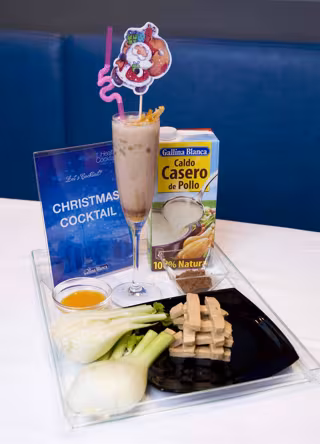 Poner el Caldo Casero de Pollo 100% Natural de Gallina Blanca en la coctelera. Añadir el zumo de turrón, el zumo de hinojo y el jarabe de azúcar con cacao. Añadir 3 cubitos de hielo y agitar todos los ingredientes en la coctelera.