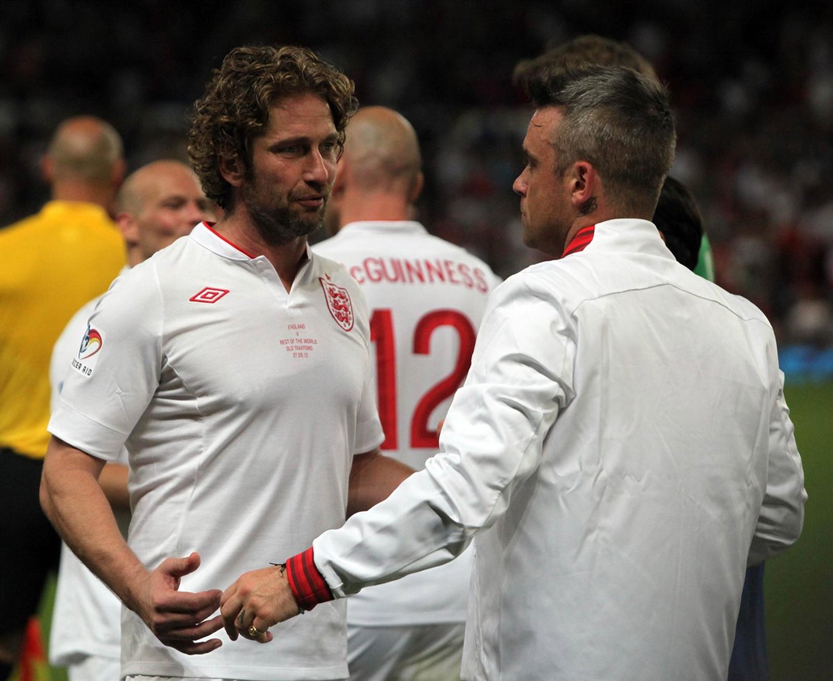 Gerard Butler y Robbie Williams durante un partido de fútbol