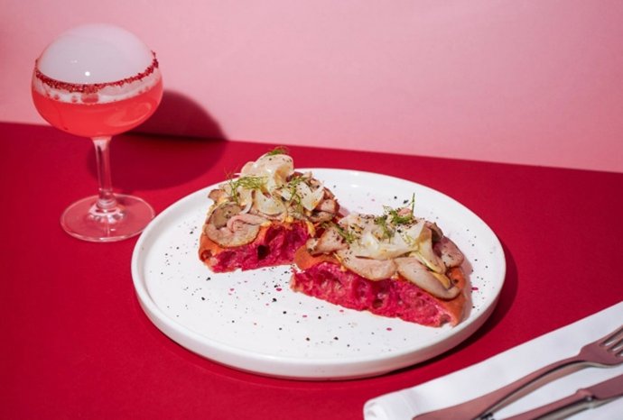 Algo más atrevido es la pizza padellino, 'Scusa se ti chiamo amore' de Baldoria, una creación elaborada con una masa crujiente y de color rosa a base remolacha, redondo de ternera cocinado a baja temperatura, mayonesa de demi-glace y mostaza Dijon, salsa de ajo negro, hinojo a la naranja y tierra de aceitunas y alcaparras con la que te explotarán los cinco sentidos. Y para brindar, el cóctel Cupido, un combinado elaborado con licor de rosa, Vermouth Blanco Cocchi, ginebra y lime ginger beer.