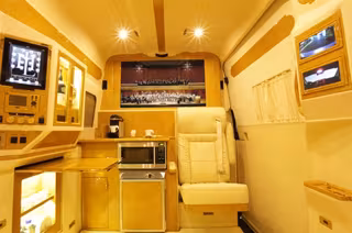 Pero como siempre se ha dicho, lo importante está en el interior. Hablamos de una furgoneta que se ha convertido en una suite de hotel de cinco estrellas que cuenta con baño y cocina. En todo el interior podemos encontrar aplicaciones de oro, por ejemplo en los lavabos. Razones para sentirse como príncipes en un lujoso palacio.