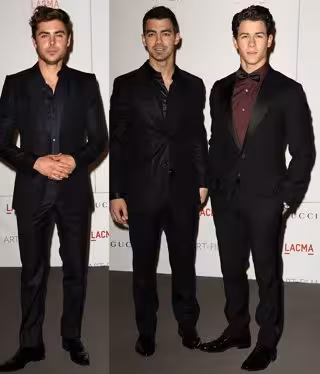 Tras sus pasos, los hermanos Jonas. Joe eligió un look total black y sin corbata para la ocasión, mientras que Nick prefirió el clásico esmoquin con pajarita negra, pero poniendo el toque diferencial con una camisa granate.