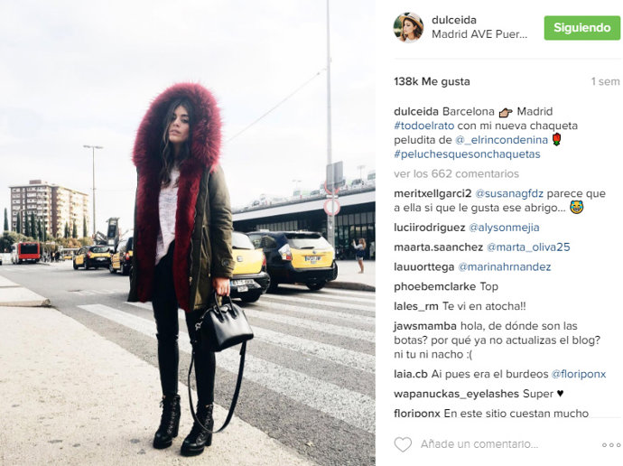 Uno de los abrigos más buscados esta temporada ha sido el típico con pelo en la capucha pero este año se ha querido ir más allá y los diseñadores han querido poner un punto de rebeldía a los típicos abrigos para que llamen más la atención: color en el pelo de la capucha. Dulceida ha sido una de las primeras que se han sumado a esta tendencia que veremos muy a menudo en los esparates.
