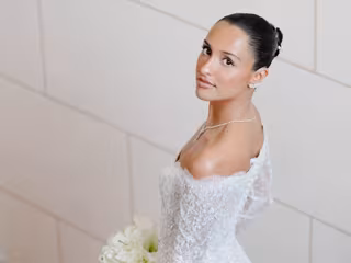 El cuerpo estructurado, con escote tipo corazón ligeramente pronunciado, se equilibra con mangas largas confeccionadas en encanje translúcido y pequeños bordados, aportando un aire atemporal y elegante.