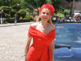 Sin dudas se trata de una pieza majestuosa confeccionada expresamente para la ocasión. Todo al rojo, el modisto también a confeccionado una diadema con plumas naturales y rejilla, que es sin duda toda una tendencia de este 2024.
