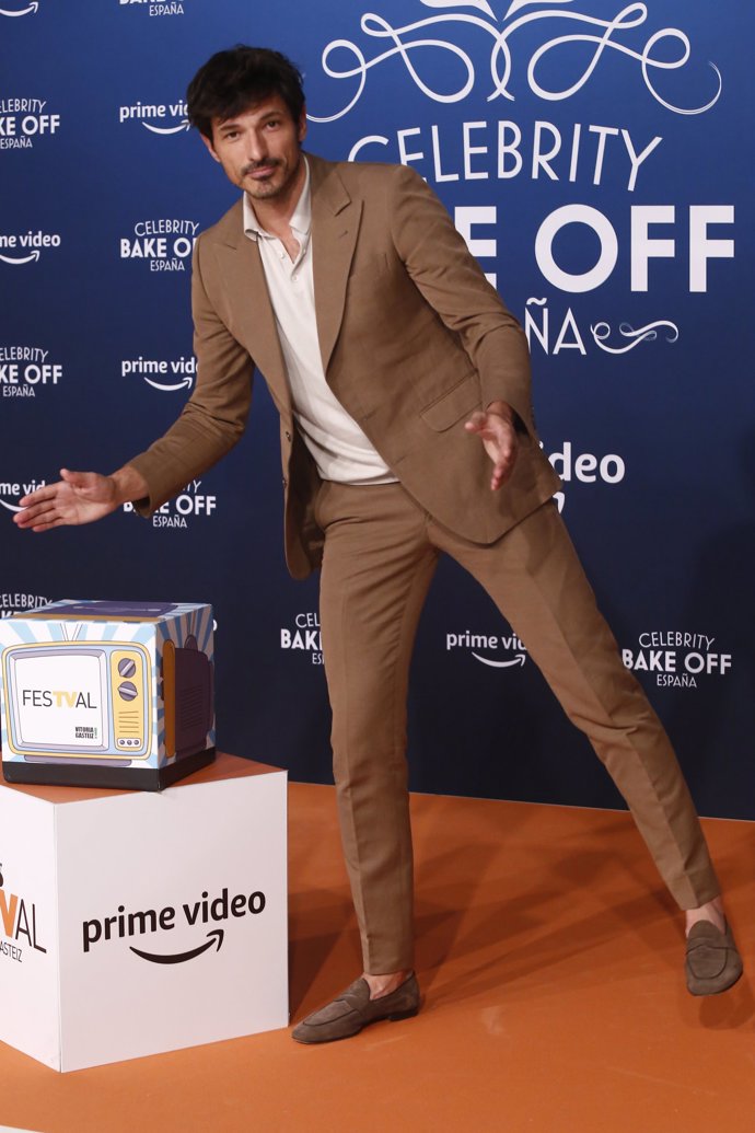 Si eres fanático de los trajes en color tierra, este te va a encantar. Es un fondo de armario ideal para la época estival. Cómodo, fresco y recto. En esta ocasión, el actor acudía a la presentación de 'Celebrity Bake Off España' en el FesTVal y destacó por combinar el traje con un polo en color crema. Arriesgado, pero sofisticado.