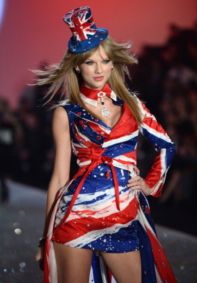 La cantante country ha tomado el relevo de Bruno Mars, quien ha sido uno de los encargados de acompañar a estos "ángeles". La artista de pennsylvania lució un atrevido vestido, inspirado únicamente en la bandera de Gran Bretaña, un look que conjuntó con sombrero y una larga cola a juego mientras interpretaba la canción "I knew you were trouble" . La impresionante Adriana Lima acompañó a la cantante luciendo un brazer empedrado y un gorro de revisora de tren.