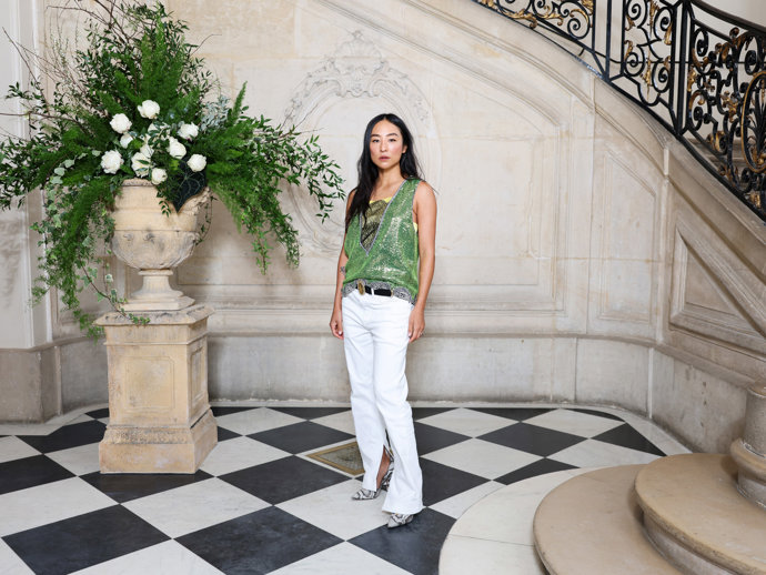 Greta Lee, arrebatadora con un lookazo formado por jeans blancos con abertura en los bajos y blusa de lentejuelas en color verde con diversos cortes asimétricos y tirantes.