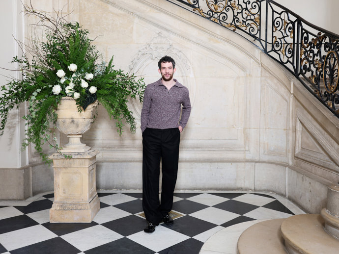 Josh O'Connor apuesta por un estilismo infalible en época invernal: pantalón negro de corte recto con polo-jersey en lana jaspeado. Una opción sencilla, elegante y muy versátil que podría ser un fondo de armario para todos.