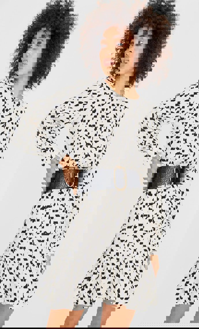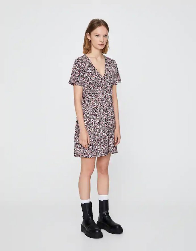 4. Vestido en tejido crepé con diseño de paneles con volumen, de manga corta, con escote en forma de pico y confeccionado en viscosa ligeramente elástica de Pull&Bear, 5.99 €.