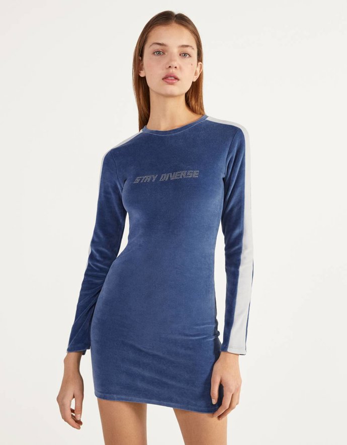 9. Vestido corto de terciopelo con fit ajustado. Cuello redondo, manga larga y banda lateral a contraste de Bershka, 3.99 €.